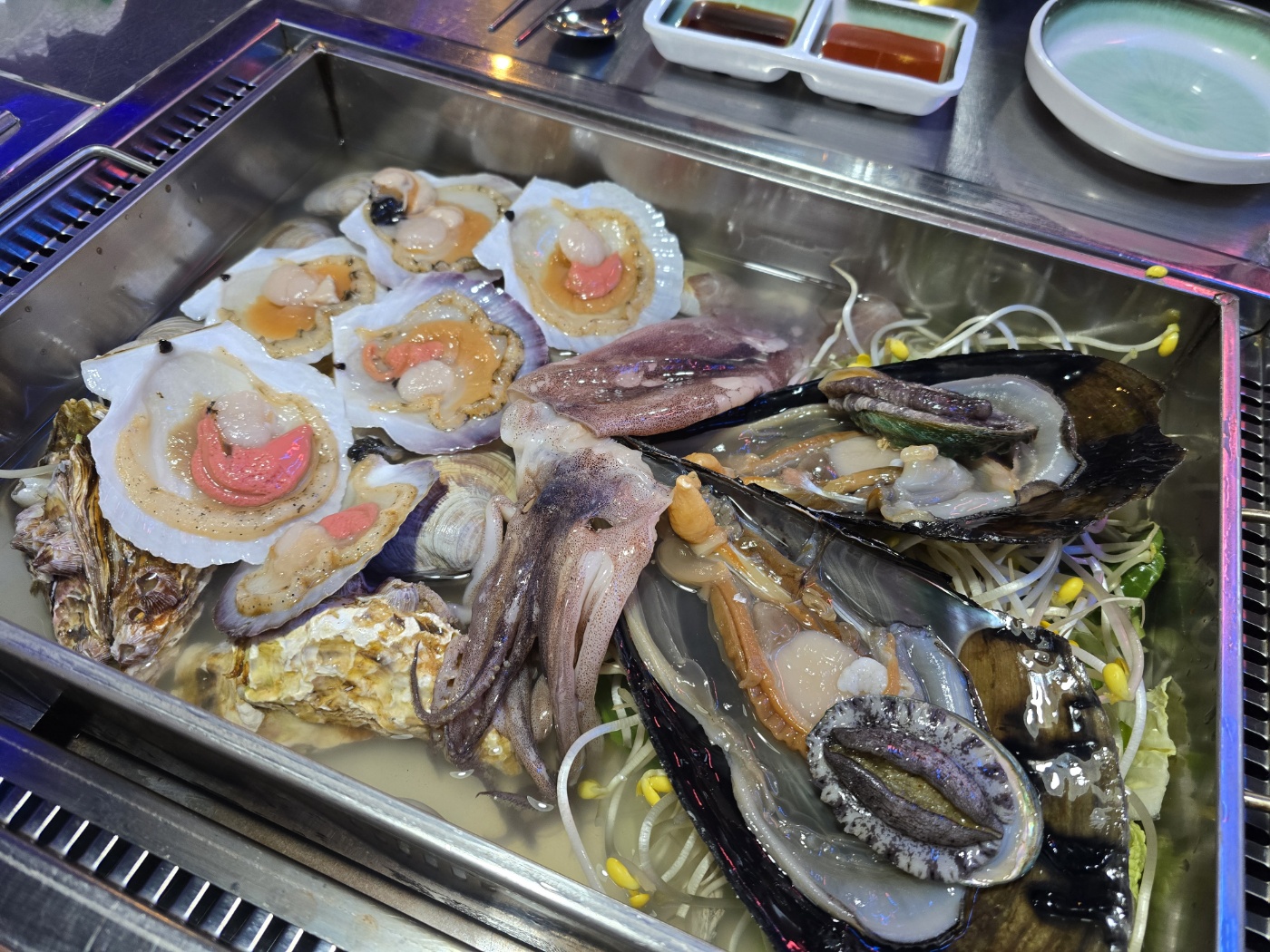 생물 조개가 종류별로 가득 올려져 나왔는데, 가리비, 키조개, 백합, 참조개, 바지락 등 7~8가지가 넘는 조개들이 푸짐하게 등장했습니다.