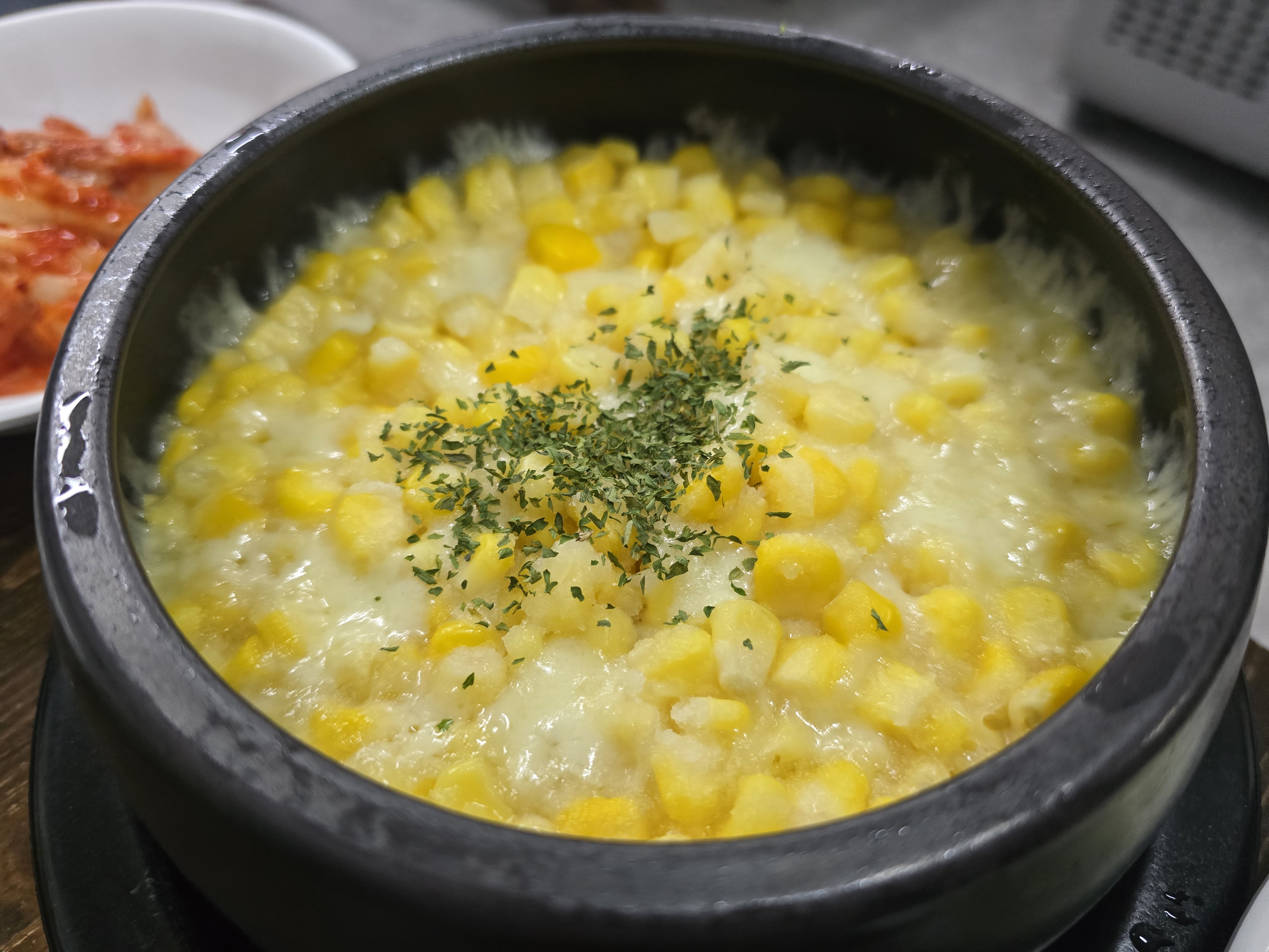 추가주문한 콘치즈는 -> 따뜻한 뚝배기 로 나옵니다