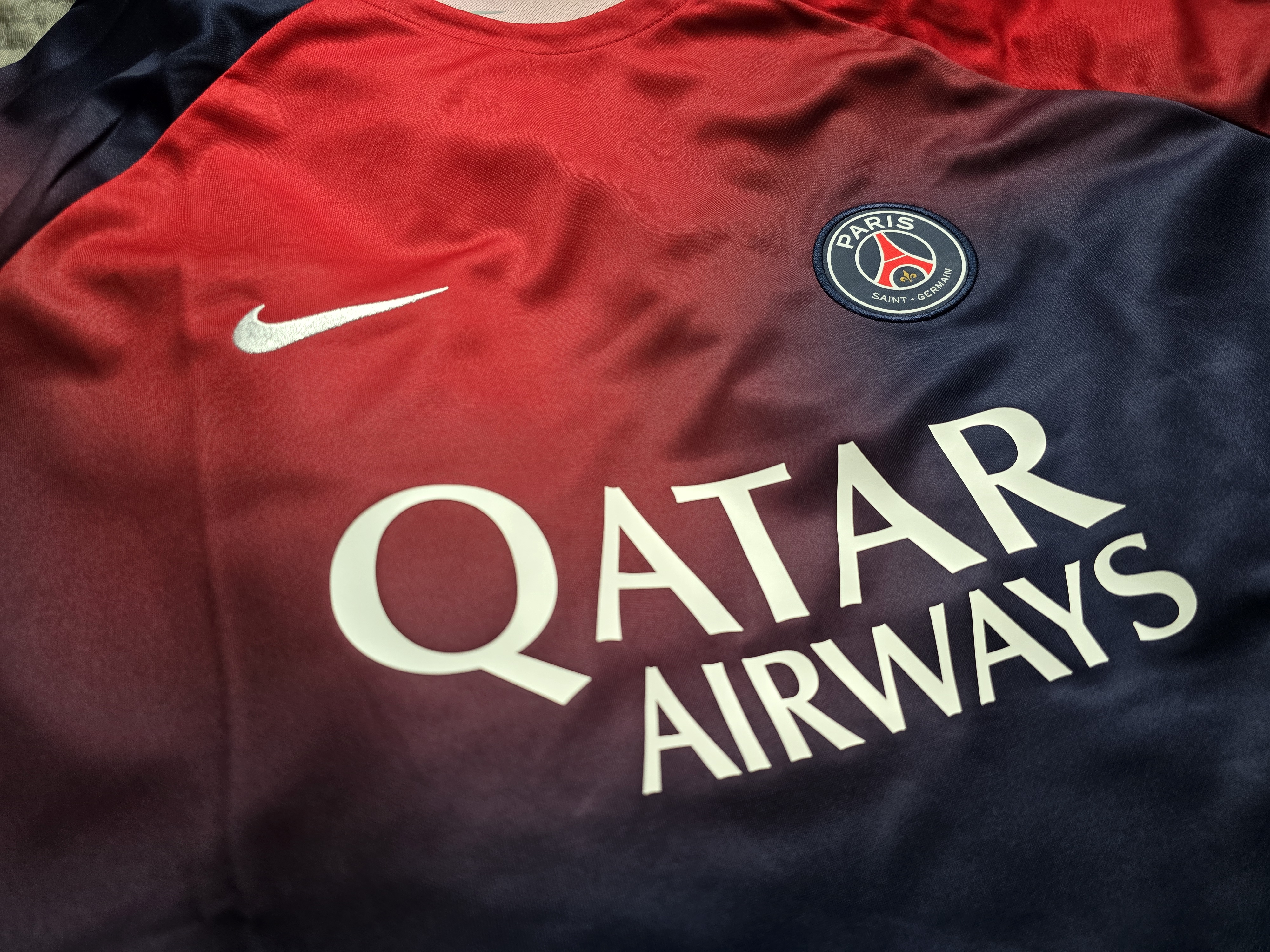 정면에는 QATAR AIRWAYS 메인 스폰서 로고, 왼쪽에는 PSG 클럽 엠블럼, 오른쪽에는 나이키 스우시 로고가 깔끔하게 새겨져 있습니다