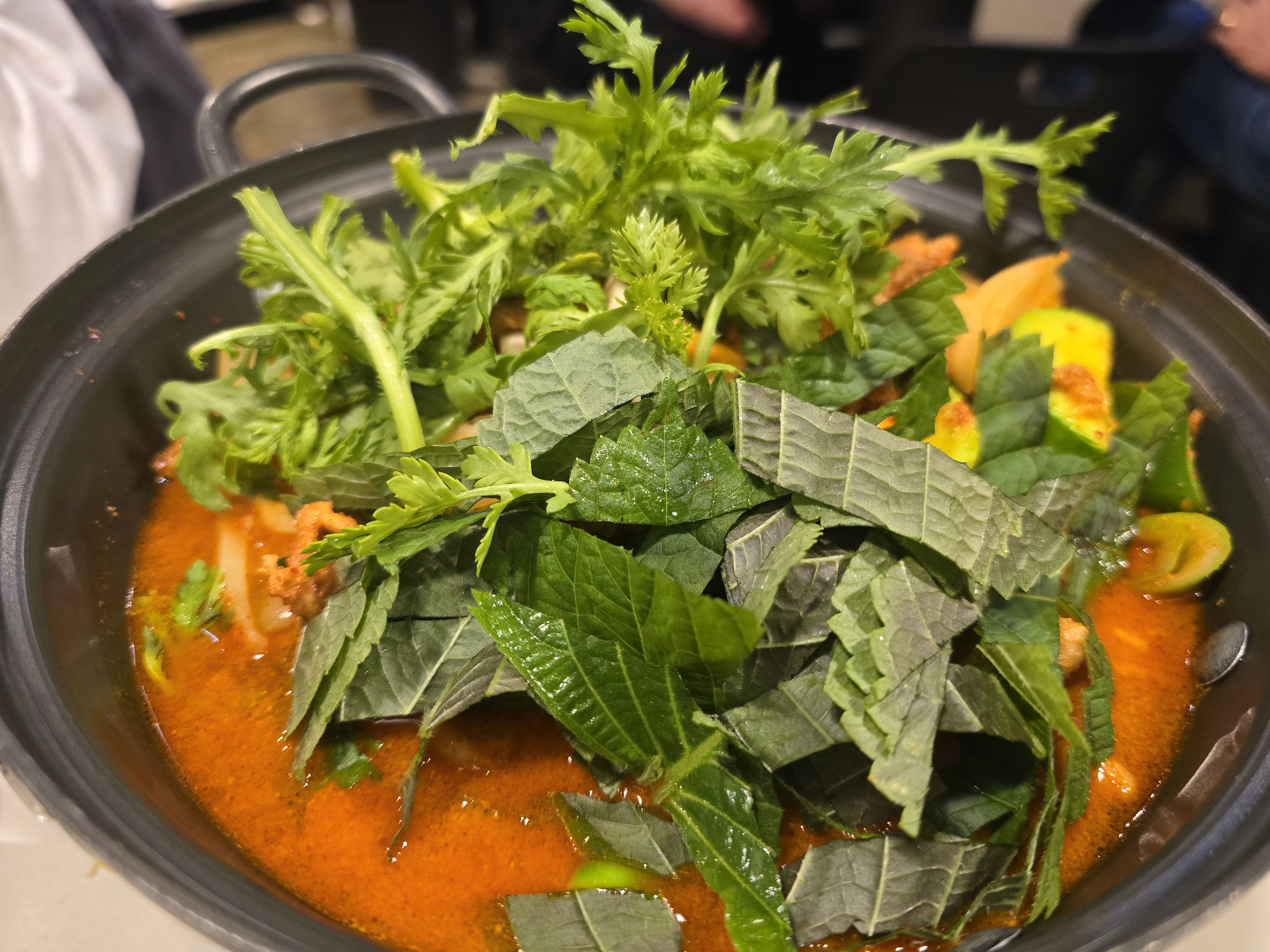 테이블에 딱 올려지자마자 빨갛게 끓는 국물 위로 깻잎과 쑥갓이 푸짐하게 올려져 있어서 비주얼부터 합격!