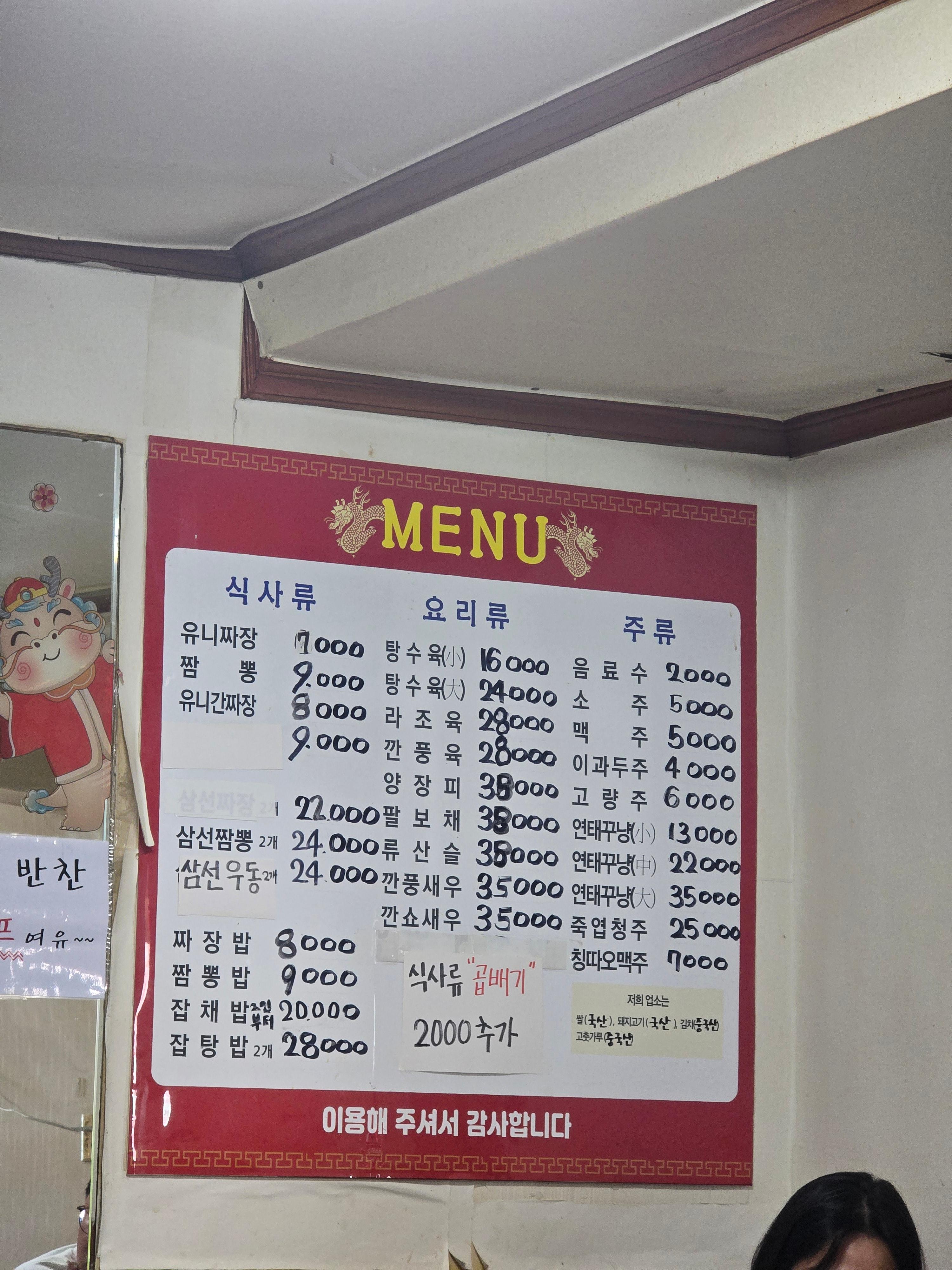 먼저 메뉴판을 보면, 기본 짜장은 8,000원, 짬뽕은 9,000원 정도로 요즘 물가에 비하면 꽤 착한 가격대였어요