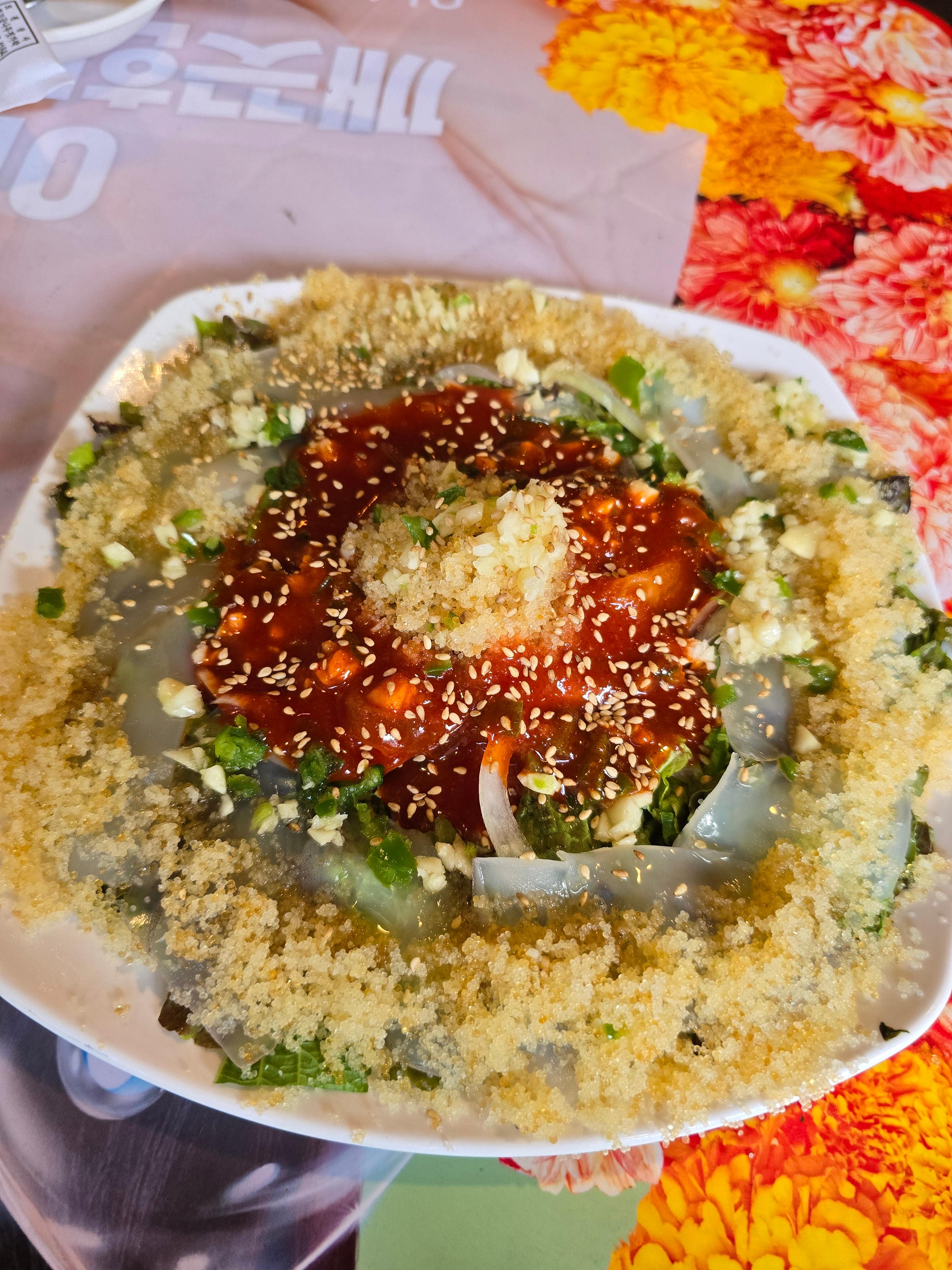 🌶️ 특제 양념의 조화: 중앙에는 매콤달콤한 초장 베이스의 양념과 다진 마늘이 듬뿍 올라가 있습니다. 오징어회와 양파등을 함께 비벼 먹으면 됩니다